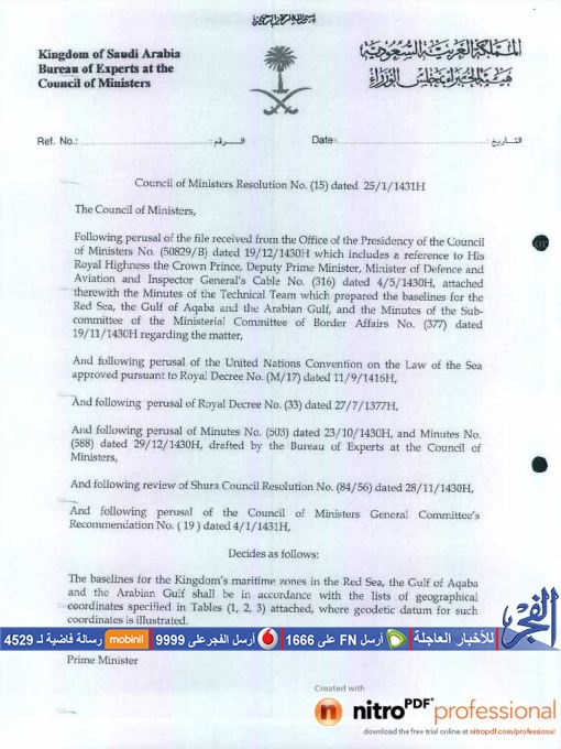 وأوضحت الوزارة تعليقًا على الوثائق، أن عدم سيادة السعودية للجزيرتين بعد التنازل عنهما لمصر عام 1950 لمواجهة إسرائيل لا ينفى تبعيتهما للسعودية، موضحة أن الدراسات القانونية ترى أن تبعية الجزيرتين وفقا لأحكام القانون الدولى هى للمملكة.