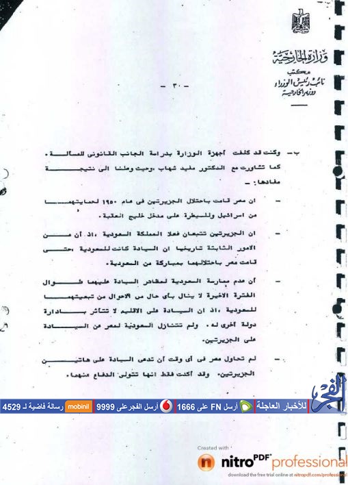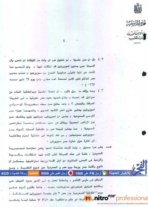 وتضمنت الوثائق التي حصلت الفجر على نسخة منها، المخاطبات الرسمية التي تمت بين الخارجية المصرية ونظيرتها الأمريكية حول ملكية الجزيرتين للمملكة العربية السعودية.