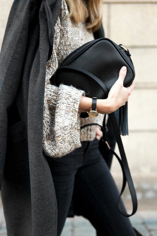 كل ماعليك فعله هو اختيار كنزة صوفية بيضاء بأكمام ضخمة وتنسيقها مع معطف كلاسيكي متوسط الطول باللون الرمادي، وحقيبة يد سوداء مزينة بالشراشيب، وساعة يد أنيقة، وبنطلون الدنيم الضيق الأسود وزوج من أحذية الأوكسفورد السوداء اللامعة.