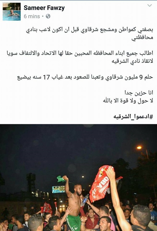 "فيس بوك" : "بصفتي كمواطن ومشجع شرقاوي قبل ان اكون لاعب بنادي محافظتي"