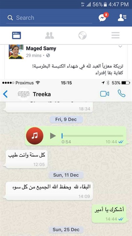 ونشر ماجد سامي عبر حسابه على "فيس بوك" نص رسالة محمد أبوتريكة له عبر واتس آب لتعزية في ضحايا الكنيسة.