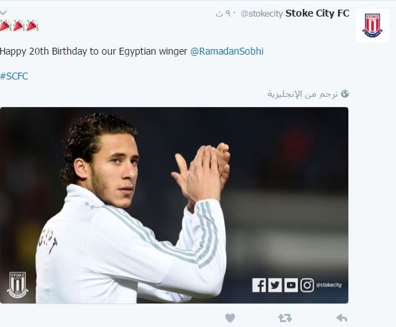 قدم نادى ستوك سيتى الإنجليزى، التهنئة  للاعبه الدولي المصرى رمضان صبحى ، بمناسبة عيد ميلاده العشرين.