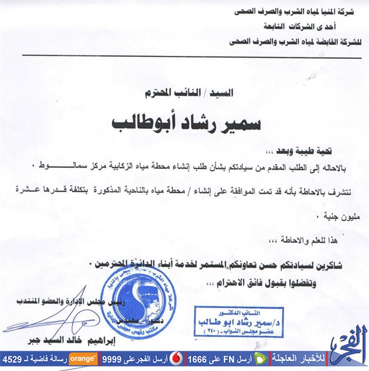 وافقت شركة مياه الشرب والصرف الصحي بمحافظة المنيا، على الطلب المقدم من النائب سمير رشاد أبو طالب، عضو مجلس النواب عن دائرة مركز سمالوط، الخاص بطلب إنشاء محطة مياه الزكابية بالمركز، وذلك بتكلفة قدرها 10 مليون جنيه.