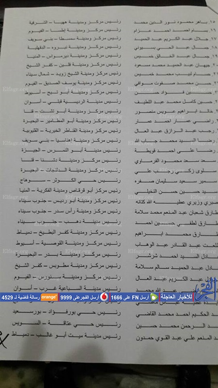 وضمت الأسماء، محمد سيد محمد محمود رئيس مركز ومدينه بلطيم كفر الشيخ، ومحمد صلاح الدين محمد ناجي رئيس مركز ومدينه فايد بالاسماعيليه، ومحمد علي محمد خميس رئيس مركز ومدينه منيه النصر بالدقهليه، ومحمد فاروق زكي احمد رئيس حى ثالث الاسماعيليه، ومحمد فهيم محمد سالم رئيس مركز ومدينه سيوه بمطروح، ومحمود شحاته محمود بريك رئيس مركز ومدينه الزرقا بدمياط، ومحمود فوزي عوض سلام رئيس حي فيصل بالسويس، ومحمود محمد سعد محمد شاهين رئيس مركز ومدينه المطريه بالدقهليه، ومحمود محمد محمود حسني ابو بهيه رئيس مركز ومدينه طهطا بسوهاج، ومسعد عبد الهادي عبد الغني الشحات رئيس مركز ومدينه النجيله بمطروح، وممدوح علي انور محمد رئيس مركز ومدينه الحمام بمطروح.