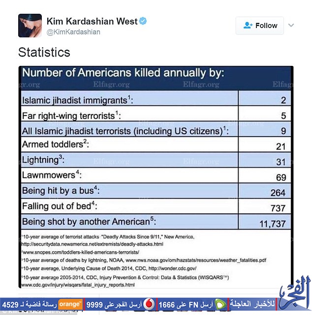 نشرت نجمة تليفزيون الواقع "كيم كاردشيان" إحصائية بالأرقام للردّ على قرار الرئيس الأمريكى دونالد ترامب، بحظر دخول مواطنى 7 دول إسلامية لأمريكا، بزعم مخاوف تتعلق بالإرهاب.