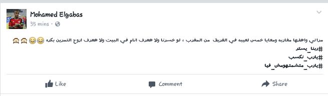 وقال الجباس عبر صفحته الشخصية : " مراتي وأهلها مغاربة ومعايا 5 لاعيبة في الفريق من المغرب، لو خسرنا لا هعرف أنام في البيت ولا أروح التمرين بكره ".