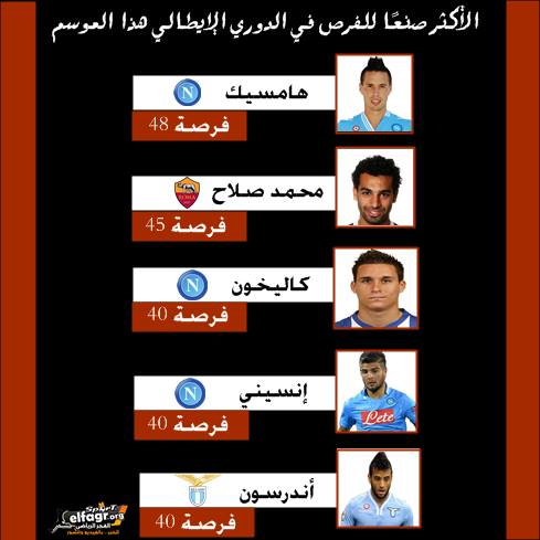 يستعرض الفجر الرياضي أبرز اللاعبين في دوري الدرجة الأولى الإيطالي، والذي أهدوا زملائهم فرصا للتسجيل في مرمى الأندية المنافسة هذا الموسم في بطولة الكالتشيو، حيث جاء محمد صلاح المحترف في صفوف روما في المرتبية الثانية بصناعة 45 فرصة ، بفارق 3 فرص فقط عن المتصدر هامشيك لاعب نابولي.