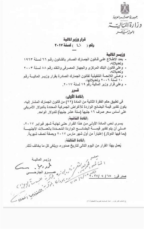 تنشر بوابة "الفجر" نص قرار وزير المالية رقم 41 لسنة 2017 الخاص بخفض الدولار الجمركي لـ 16 جنيهًا بدءًا من غدا الخميس.