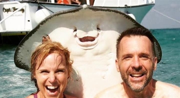 قام زوجين بالتقاط صورة تذكارية أثناء إجازتهما في إحدى الجزر السياحية، ويظهر معهما في الماء سمكة الراي التي بدت مبتسمة بشكل مثير.