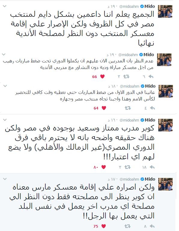 وقال "ميدو" عبر حسابه الشخصي على موقع التواصل الاجتماعي "تويتر": "الجميع يعلم اننا داعمين بشكل دايم لمنتخب مصر في كل الظروف ولكن الإصرار علي إقامة معسكر المنتخب دون النظر لمصلحة الأندية نهائيا فيه تقليل وعدم احترام من كوبر لمدربي فرق الدوري".