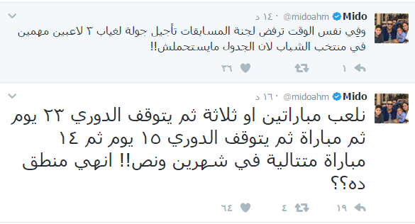 وأكمل: "نلعب مباراتين او ثلاثة ثم يتوقف الدوري ٢٣ يوم ثم مباراة ثم يتوقف الدوري ١٥ يوم ثم ١٤ مباراة متتالية في شهرين ونص!! انهي منطق ده؟؟".