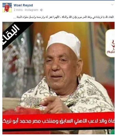 وكتب وائل رياض علي صفحته الشخصيه فيس بوك: "البقاء لله يا تريكة في وفاة المرحوم بإذن الله والدك ، اللهم اغفر له وارحمه واجعل مثواه الجنة".