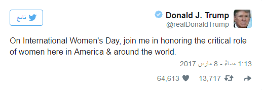 وبعد أن سبقه الرئيس الروسي فلاديمير بوتين في تقديم واجب التهنئة للنساء في روسيا، عبّر ترامب عبر "تويتر" عن احترامه الشديد للمرأة، وقال في تغريدة له: "عندي احترام كبير للمرأة على مختلف الأدوار التي تؤديها في حياتنا، والتي تعتبر — الأدوار- أمراً حاسماً في بنيتنا الاجتماعية والاقتصادية".