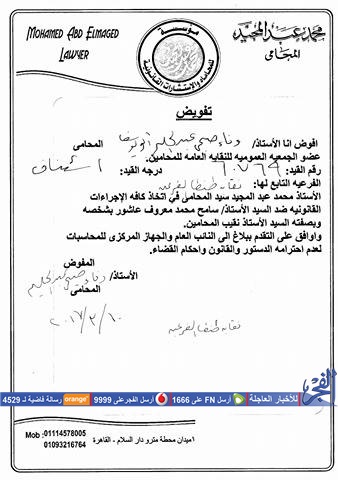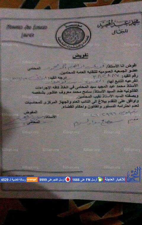 حصلت "الفجر" على مجموعة تفويضات لعدد من المحامين، يفوضون محمد عبد المجيد، محامى حقوقي، لتقديم بلاغ للنائب العام، ضد، سامح عاشور نقيب المحامين.