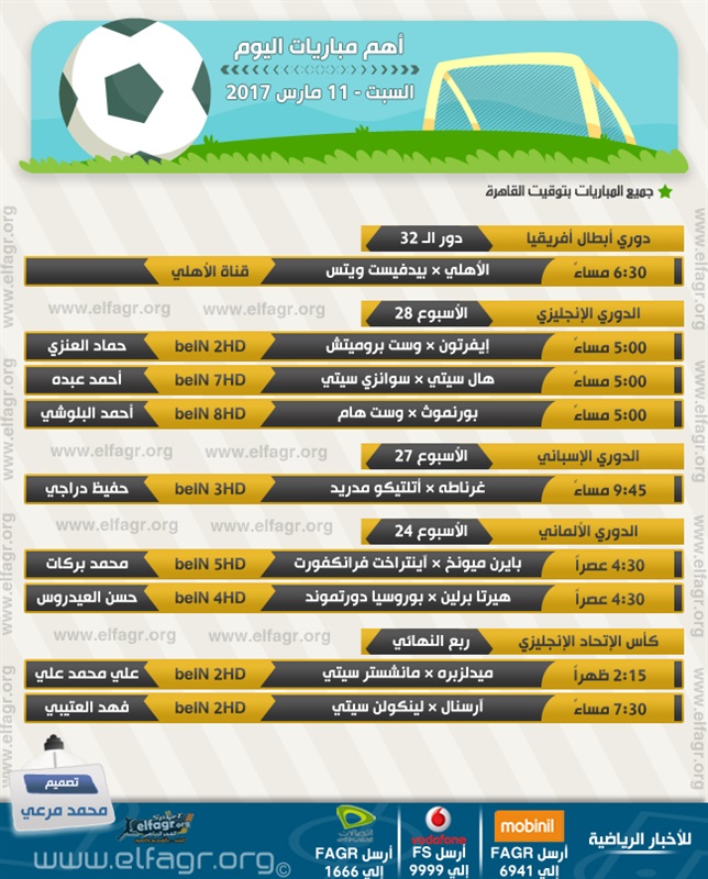 مواعيد مباريات اليوم 11-3-2017 والقنوات الناقلة الفجر الرياضي السبت 11/مارس/2017 - 06:57 ص 3/11/2017 6:57:00 AM محمد مرعي الأهلي يحرص ''الفجر الرياضى'' على تقديم جدول يومي، بمواعيد أهم المباريات فى جميع البطولات و المواجهات .. تعرف على مواجهات اليوم السبت 11 مارس كووورة كورة رياضة الاخبار الرياضية الأهلي اخبار الرياضة اخبار الرياضة اليوم 11 مارس