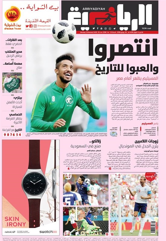 وعنونت صحيفة "الرياض" السعودية "منتخبنا يودع المونديال بدربى العرب مع مصر" مشيرة إلى أن الأخضر مطالب بالفوز على مصر التي خيبت الآمال في المونديال.