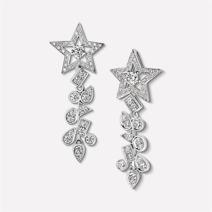 كما قدمت دار شانيل CHANEL أقراطاً من مجموعة كوميت Comete مصنوعة أيضاً من الذهب الأبيض ومرصّعة بأحجار الماس. وهي أقراط متدلية تبدأ بقطعة ماسية على شكل نجمة ويتدلى منها حبيبات آخر على شكل أوراق الأزهار.