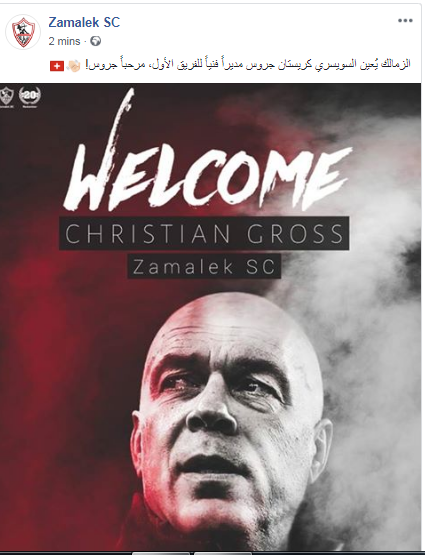 الاجتماعي "فيس بوك": "الزمالك يُعين السويسري كريستان جروس مديراً