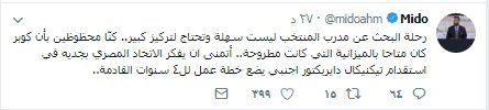 وغرد ميدو عبر حسابه بموقع التواصل "تويتر" :"رحلة البحث عن مدرب المنتخب ليست سهلة وتحتاج لتركيز كبير.. كنّا محظوظين بأن كوبر كان متاحا بالميزانية التي كانت مطروحة".