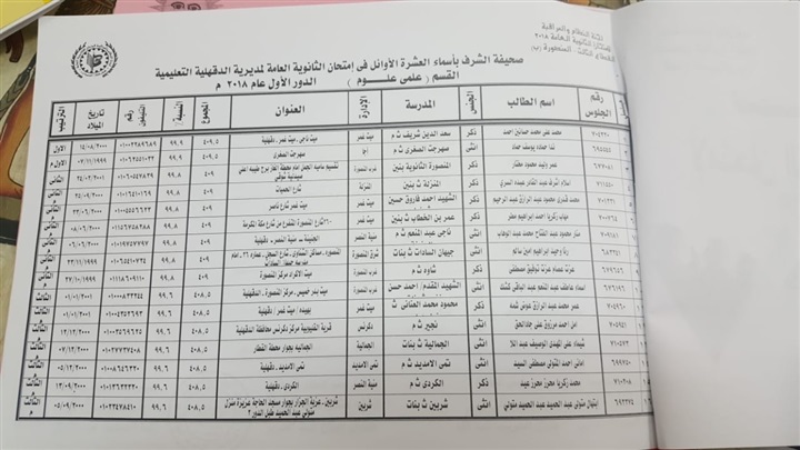 أعلن علي عبد الرؤوف وكيل وزارة مديرية التربية والتعليم في محافظة الدقهلية بأسماء العشرة الأوائل ثانوية عامة شعبة علمي علوم.