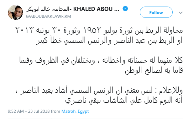 قال المحامي خالد أبو بكر، إن محاولة الربط بين ثورة يوليو ١٩٥٢ وثورة ٣٠ يونيه ٢٠١٣ أو الربط بين الزعيم جمال عبد الناصر والرئيس عبد الفتاح السيسي "خطأ كبير".