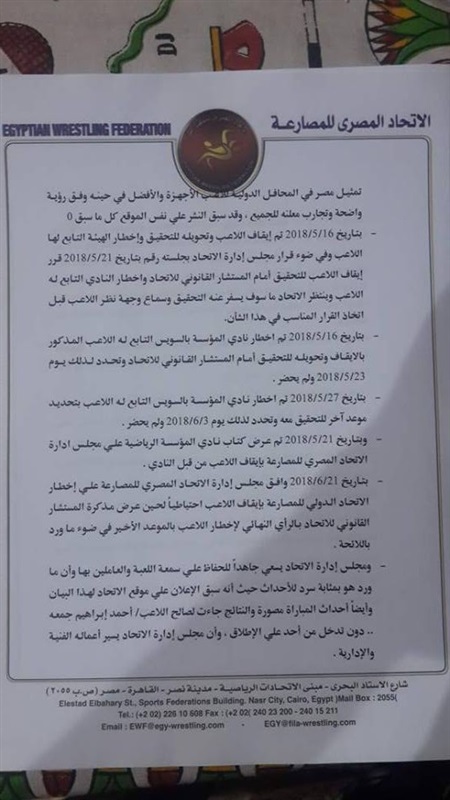 أصدر مجلس إدارة اتحاد المصارعة المصري برئاسة عصام نوار بيانًا عن أزمة حصول محمود فوزي السباعي رشاد لاعب نادي المؤسسة العسكرية بالسويس على الجنسية الأمريكية واتهام مسئولي الاتحاد باختيار من هو أقل منه في دورة ألعاب البحر المتوسط.