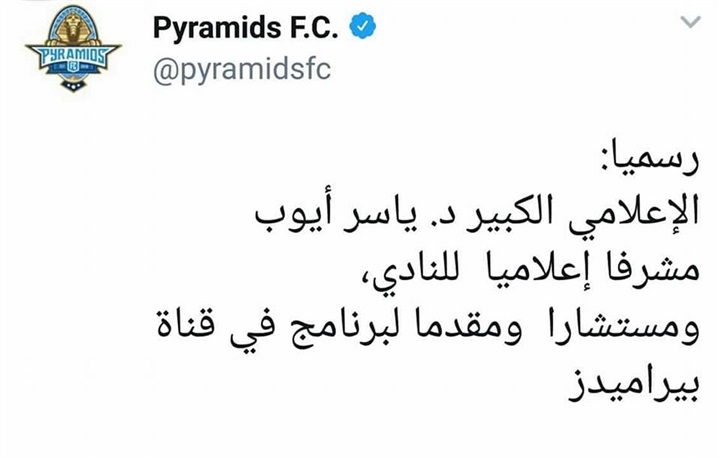 عاجل.. ياسر أيوب مشرفا إعلاميا ومستشارا لنادي بيراميدز