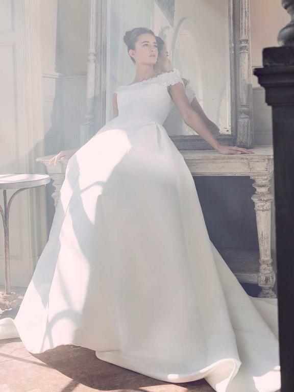 يمكن اختيار فستان زفاف بقصّة عمودية، ولكن واسعة قليلاً بحيث لا تبرز الساقين، مثل فستان زفاف Liancarlo وفستان زفاف نعيم خان Naeem Khan.