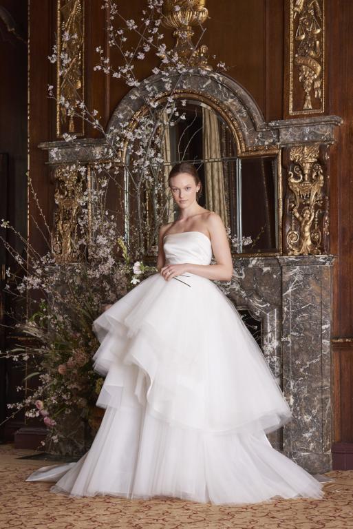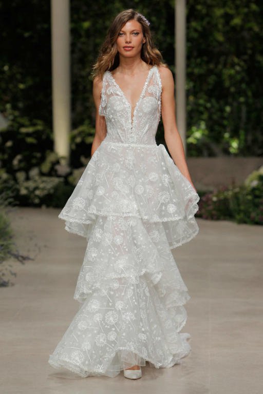 وتعتبر فساتين الزفاف بالتنورة ذات الطبقات متدرجة الأطوال من التصاميم الخادعة في مظهر النصف السفلي من الجسم، مثل فستان زفاف مونيك لولييه Monique Lhuillier وفستان زفاف برونوفياس Pronovias.
