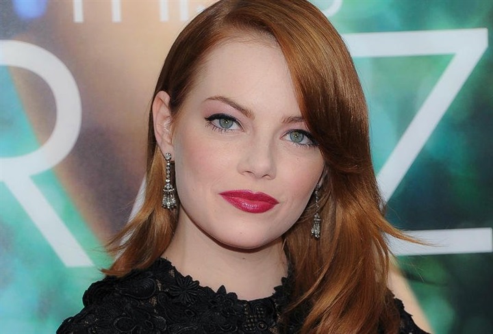 مع بشرتها الفاتحة استخدمت Emma Stone إيما ستون درجة الأحمر النبيذي المائل للموف، مع بلاشر وظل جفون وردي، واستخدمت الأيلاينر لتوسيع عينيها، مع رموش متوسطة الكثافة.