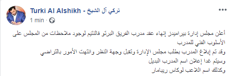 وتابع: "وقد تم إبلاغ المدرب بطلب مجلس الإدارة وتقبل