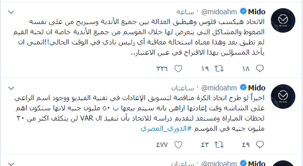 وكتب ميدو عبر صفحتة الرسمية على موقع التواصل الاجتماعي "تويتر": "من حق الأهلي ان يغضب بالمستوى التحكيمي الرديء الذي ظهر به طاقم التحكيم بالكامل في مباراتهم ضد الانتاج وأتعجب مِن عدم اعتراض الاسماعيلي على حكام مباراتهم امام الأهلي الذي لولاهم لخرج الاسماعيلي فائزا وأتعجب من إدارة الانتاج بعدم الاعتراض على عدم طرد الشناوي!! #الدوري_المصري".