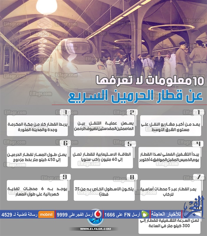 انفوجراف.. 10 معلومات لا تعرفها عن قطار الحرمين السريع انفوجراف الأحد 30/سبتمبر/2018 - 02:35 م 9/30/2018 2:35:00 PM مكة المكرمة مكة محمد بن سلمان قطار مكة السريع قطار الحرمين السريع قطار الحرمين قطار سرعة قطار الحرمين السريع خط قطار الحرمين خادم الحرمين الشريفين تكلفة قطار الحرمين السريع الملك سلمان المدينة المنورة المدينة السعودية الرياض