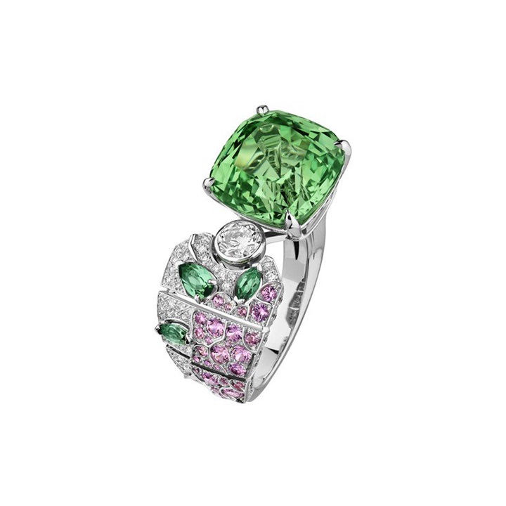 ومن القطع الفاخرة التي لفتت نظرنا في مجوهرات هذا الموسم، هذا الخاتم الذي قدّمته دار شانيل CHANEL ضمن خط مجوهراتها الراقية CHANEL Fine Jewelry في مجموعة كورومانديل Coromandel. وهو خاتم مصنوع من من الذهب الأبيض ومرصّع بأحجار الياقوت والتورمالين والماس.