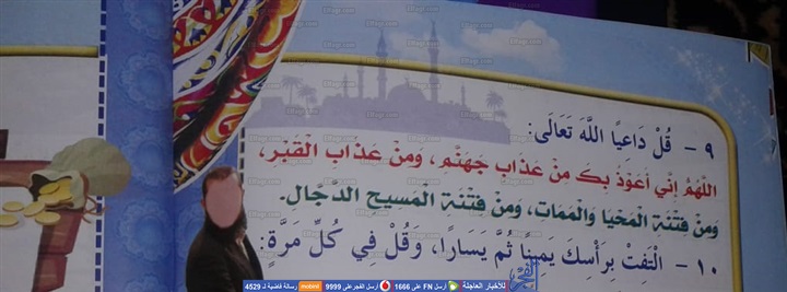 ويوضح الكتاب في الصفحة رقم 30، أن هناك دعاء يقال أثناء الصلاة وهو: "اللهم إني أعوذ بك من عذاب جهنم ومن عذاب القبر ومن فتنة المحيا والممات ومن فتنة المسيح الدجال".