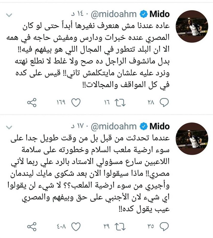 وغرد ميدو عبر حسابه الشخصي بموقع التواصل "تويتر" :"عندما تحدثت من قبل بل من وقت طويل جدا على سوء ارضية ملعب السلام وخطورته على سلامة اللاعبين سارع مسؤولي الاستاد بالرد علي ربما لأني مصري!!".
