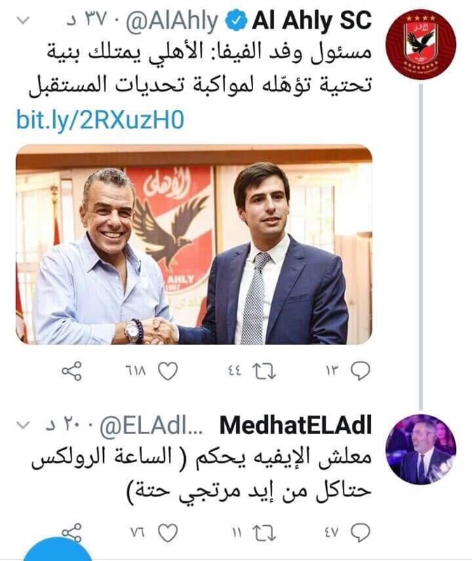 وعلق العدل على صورة للصفحة الرسمية للنادي الأهلي عبر "تويتر"، يظهر بها خالد مرتجى عضو مجلس الإدارة، مع مسؤول بوفد الفيفا قائلًا :"معلش الايفيه يحكم الساعة هتاكل من ايد مرتجى حتة".