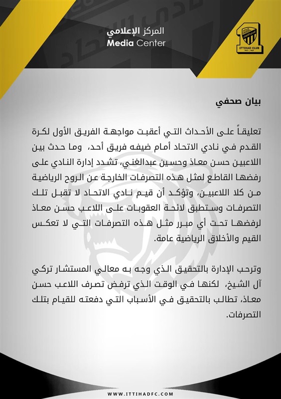 رحبت إدارة نادي اتحاد جدة، برئاسة نواف المقيرن، بالتحقيق الذي وجه به معالي المستشار تركي آل الشيخ، رئيس الهيئة العامة للرياضة، في واقعة اعتداء حسن معاذ على حسين عبد الغني لاعب أحد.