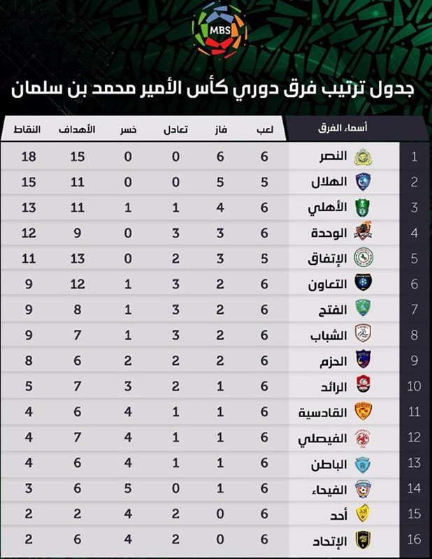 انتهت منافسات مباريات الجولة السادسة من دوري كأس الأمير محمد بن سلمان للمحترفين، واستمرت سيطرة نادي النصر على صدارة جدول الترتيب برصيد 18 نقطة متفوقًا على الهلال والأهلي.