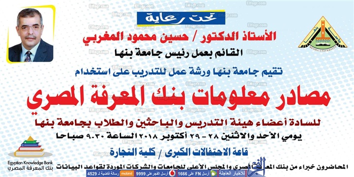 يفتتح الدكتور حسين المغربى القائم بأعمال رئيس جامعة بنها، غدًا الأحد ورشة عمل للتدريب على مصادر استخدام بنك المعرفة المصرى، والتي تستمر أعمالها علي مدي يومين بقاعة الاحتفالات بمجمع الكليات.