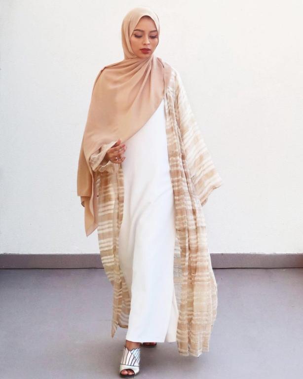 وقد اعتمدت مدونات الموضة المحجبات عبايات بقصّة مفتوحة من الأمام، مثل عباءة الفاشينيستا آسيا Ascia، بصيحة الألوان المتدرجة Ombre، والتي نسقت معها أزياء وحجاباً باللون الأبيض وحقيبة باللون البيج.