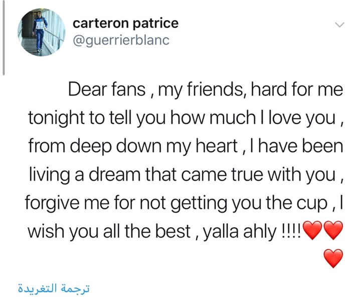 وغرد كارتيرون عبر حسابه بموقع التواصل "تويتر" :"من الصعب أن أصف مدى حبي لجماهير الأهلي".