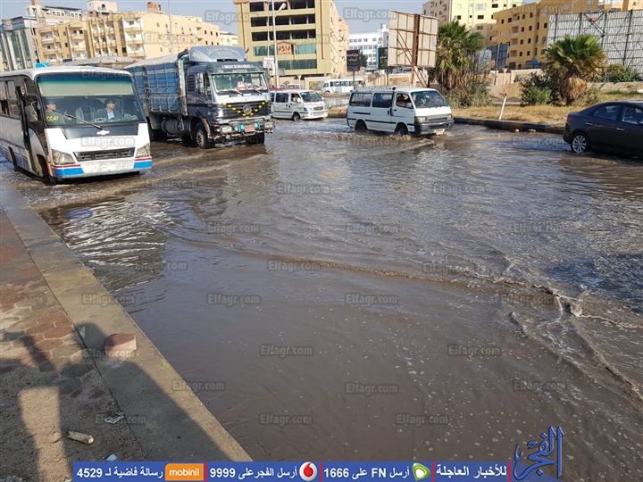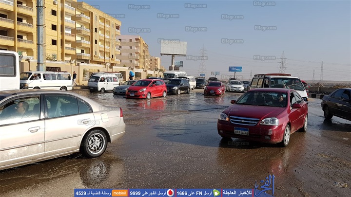 كثافات مرورية إثر كسر ماسورة مياه بطريق الفيوم (صور)