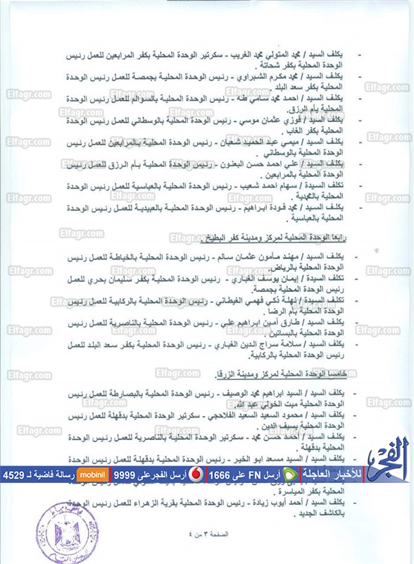 كما تضمن القرار عودة رؤساء الوحدات المحلية بقرى السيالة، عزب النهضة، الرياض، جمصة، كفر المنازلة، سيف الدين، الكاشف والسنانية إلى جهة عملهم الأصلية وكذلك ندب رئيس الوحدة المحلية بكفر الغاب للعمل بإدارة المتابعة بديوان عام المحافظة