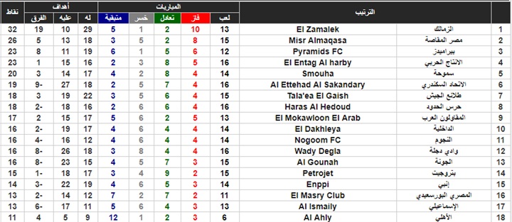 جدول ترتيب الدوري المصري بعد مباريات الإثنين 26-11-2018