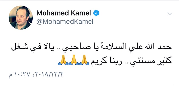 وغرد كامل عبر حسابه الشخصي بموقع التواصل "تويتر" :"حمد الله علي السلامة يا صاحبي .. يالا في شغل كتير مستني .. ربنا كريم".