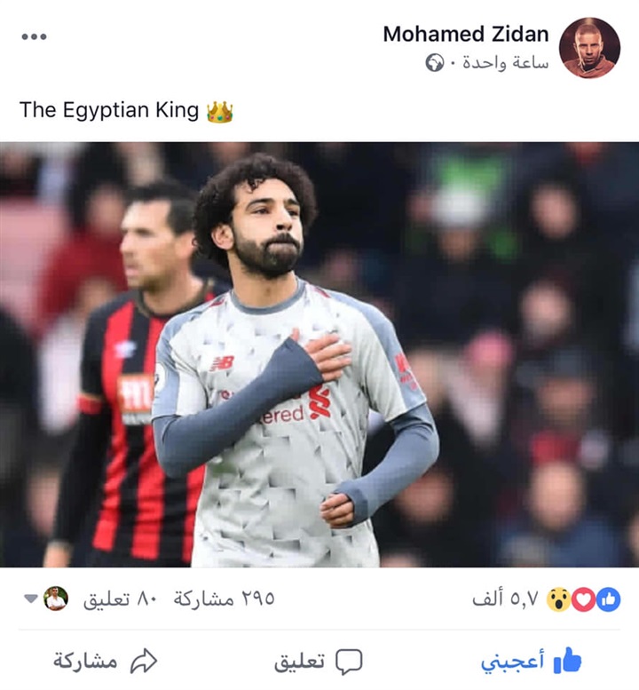 ونشر زيدان عبر حسابه بموقع التواصل "فيس بوك" صورة لمحمد صلاح بعد إحرازه لأحد الأهداف في مباراة اليوم وكتب م قائلا :"ملك مصر".