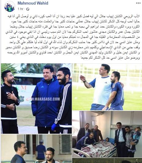 وكتب محمود عبر حسابه بموقع التواصل "فيس بوك" :"الأب الروحي الكابتن إيهاب جلال الي ليه فضل كبير عليا بعد ربنا ان أنا العب كوره تاني و أوصل للي أنا فيه حاليا أحب أوجه كل الشكر لكابتن إيهاب جلال عملني حاجات كتير جدا واتعلمت منه حاجات كتير جدا جوه الكوره وبره الكوره والكابتن حمد ابراهيم الي بحبه جدا و تعب معايا جدا في فتره الكابتن إيهاب جلال وطبعا الكابتن جمال عمر والكابتن مجدي عاشور".