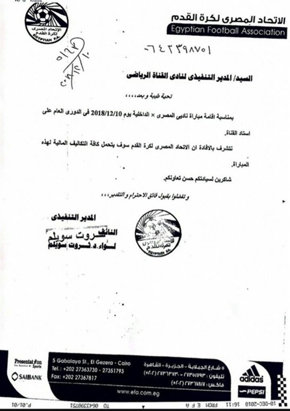أرسل الاتحاد المصري لكرة القدم برئاسة هاني أبوريدة، خطابًا رسميًا إلى نادي القناة منذ قليل، يخطره فيه بتحمله كافة تكاليف لقاء المصري والداخلية، ضمن مباريات الدوري العام.