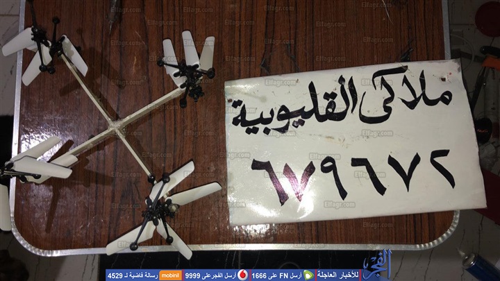 ، هيكل بدائي الصنع مثبت به عدد 4 مواتير طائرات ريموت كنترول مشابه لطائرات التصوير